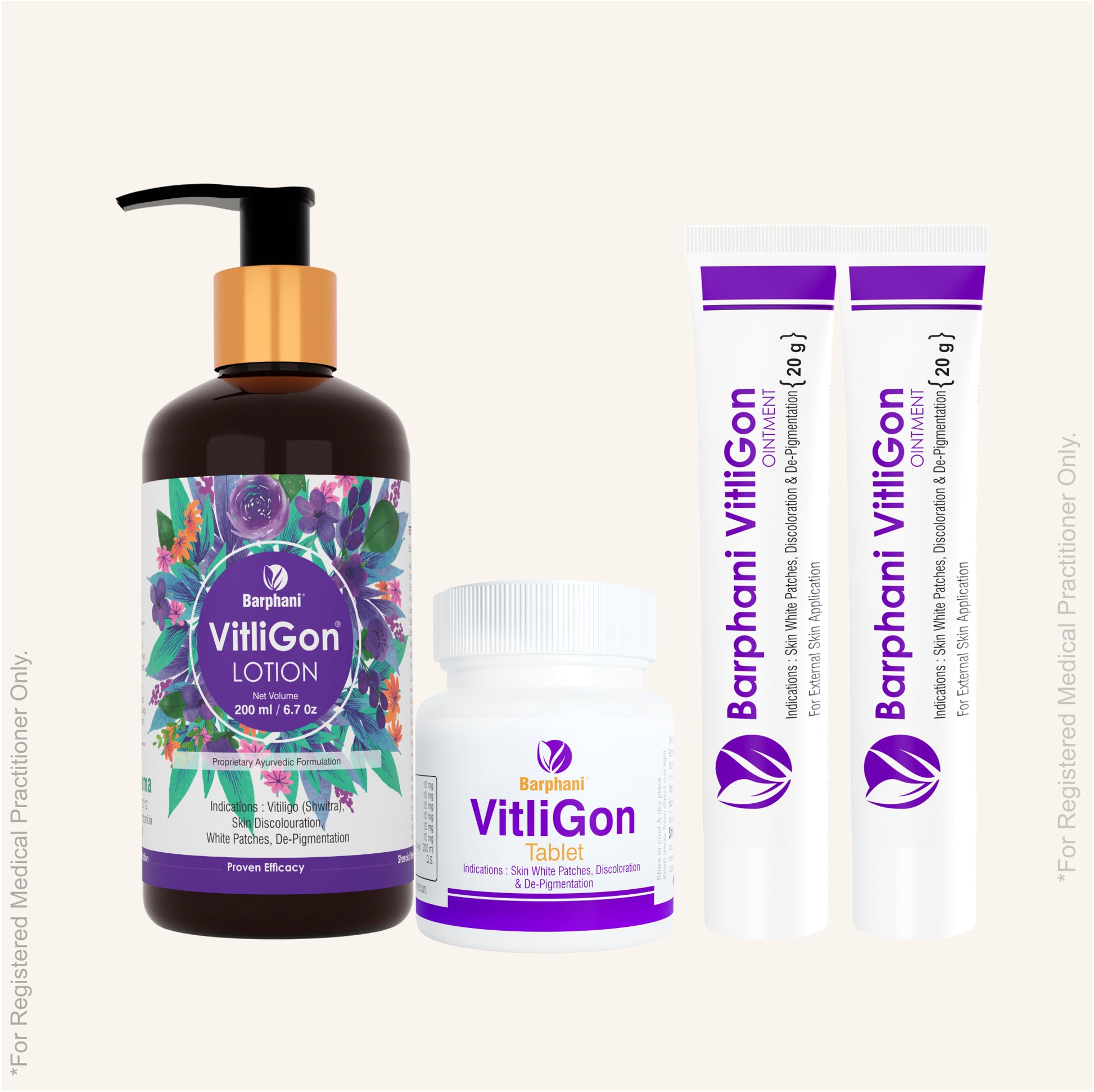 Barphani VitliGon Essential Kit- Presenting this researched, tested & proven potent combination of VitliGon Ointment, VitliGon Lotion and VitliGon tablet for Vitiligo, discolouration and white patches on skin. It is a result of 30+ years of continuous research by qualified Ayurvedic practitioners who have consulted thousands of Vitiligo cases over the years. Effective Vitiligo management requires a holistic approach rather than isolated or just symptomatic one to get best outcomes. Hence we have this potent combination specially formulated to work on the root causes of vitiligo to get faster and better results all naturally, without the adverse effects of steroids.
