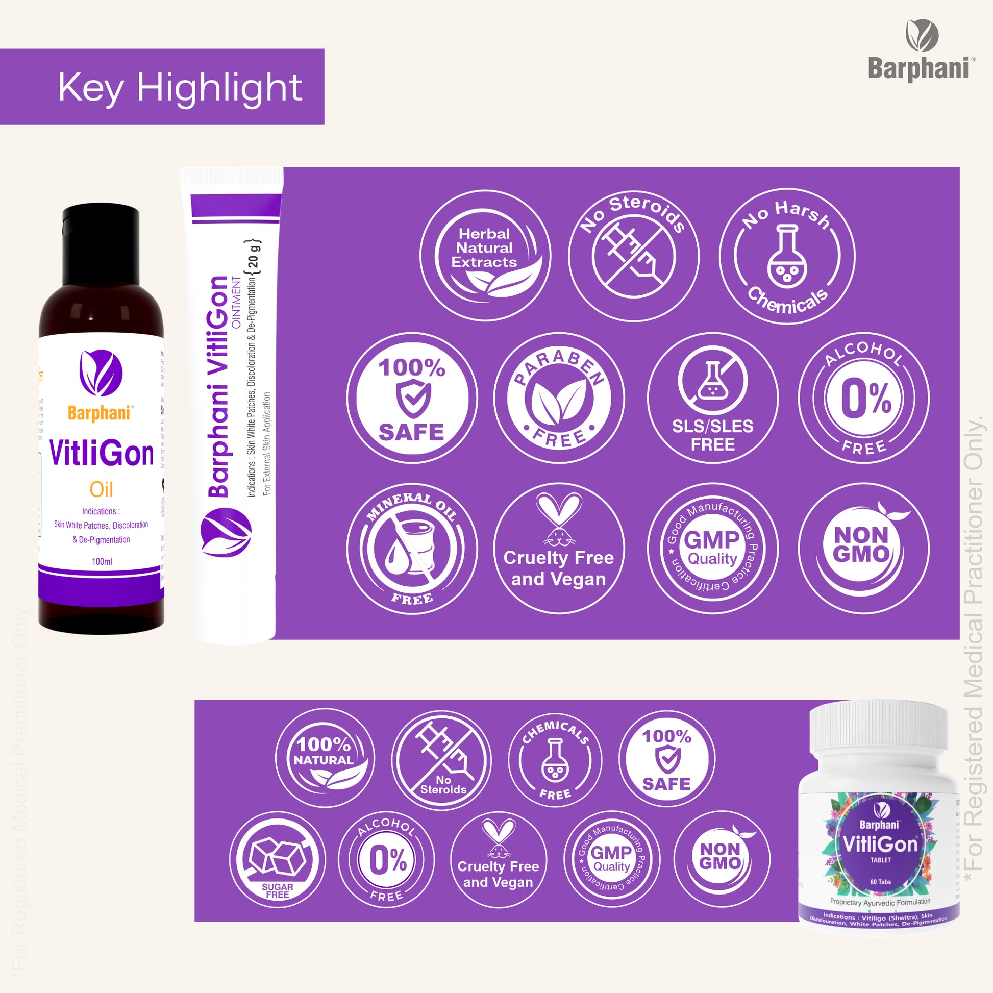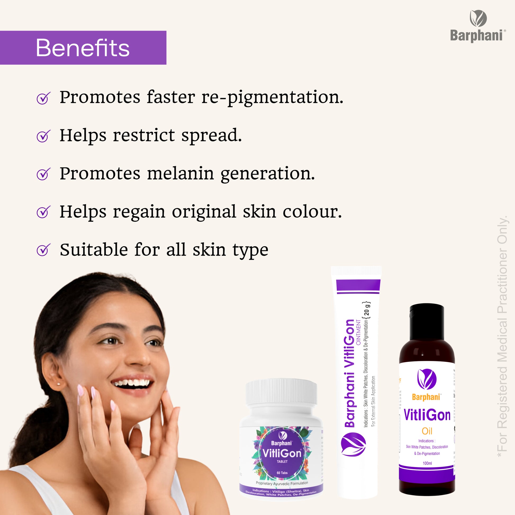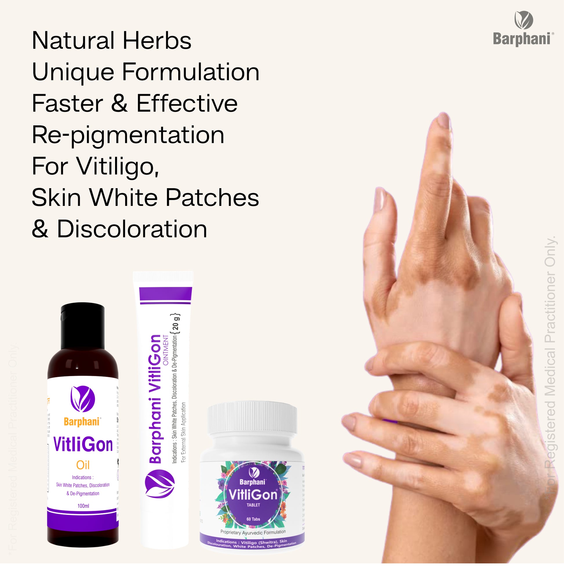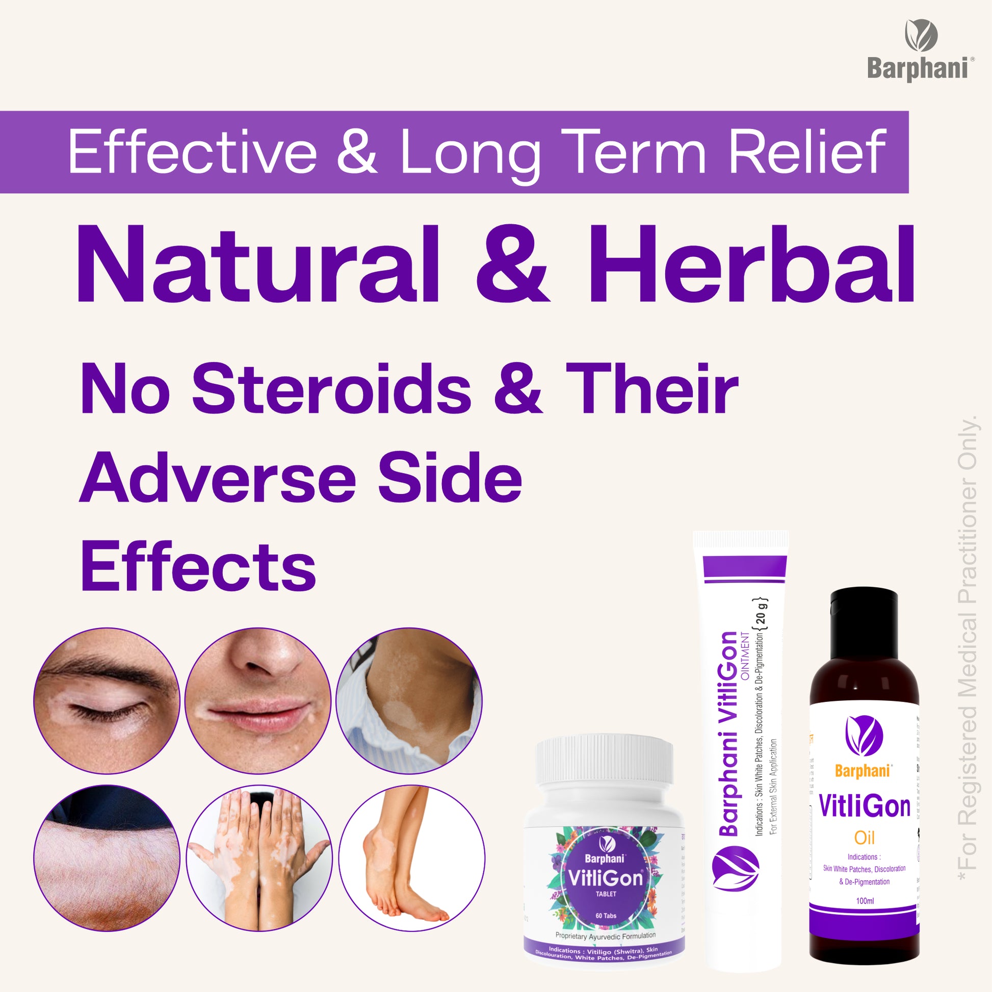 वर्षों से हजारों लोगों ने इन प्रोडक्ट का उपयोग किया है। वे विटिलिगो के लिए एक उत्कृष्ट चिकित्सा के रूप में काम करते हैं। क्रीम और गोलियों का एक साथ संयोजन प्रभावित त्वचा क्षेत्रों के पुन: रंजकता में मदद करता है, प्रसार को प्रतिबंधित करता है और मूल त्वचा का रंग वापस प्राप्त करता है।
